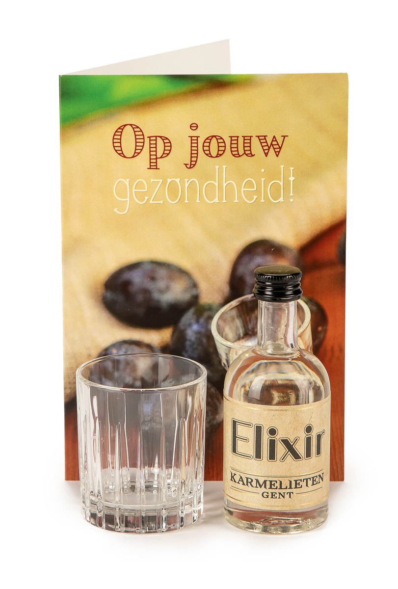 Info: Op jouw gezondheid - zoetInhoud: flesje Karmelietenelixir 6 cl + glaasje + dubbelkaart met enveloppePrijs: € 8.95